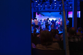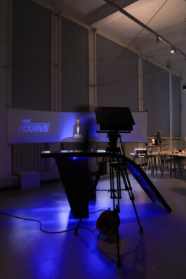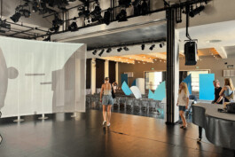 Der zentrale Bühnenraum fungierte als Übergangsraum zur Tanzfläche die sich in der angrenzenden Kantine befand. Während des Festes wurden sowohl die Bühne als auch die Tanzfläche von Tanz-Performances und animierenden Clowns bespielt. Animationsfilme die im Studiengang Multimedia Productions entstanden wurden in die räumliche Bespielung einbezogen und Teil der Raumgestaltung. Der Entwurf griff das Motiv des bewegten Raumes sowie die Idee der Bühne als Experimentierraum auf. Ziel war es, einen experimentellen Bühnen und Tanzraum zu entwickeln, der die Besucher:innen in ein Erlebnis eintauchen lässt und die Grenzen zwischen Bühne und Publikum verschwimmen lässt.